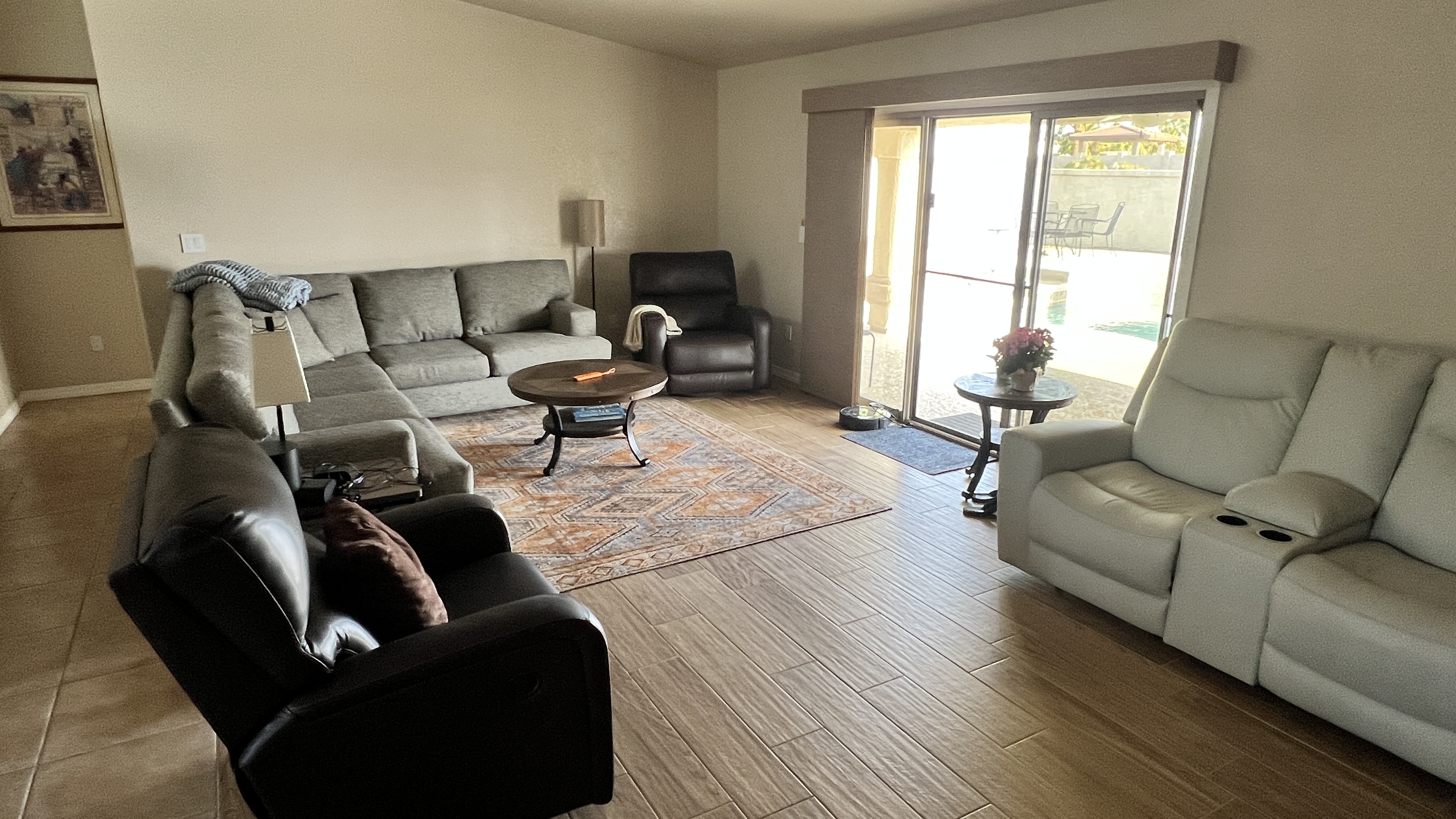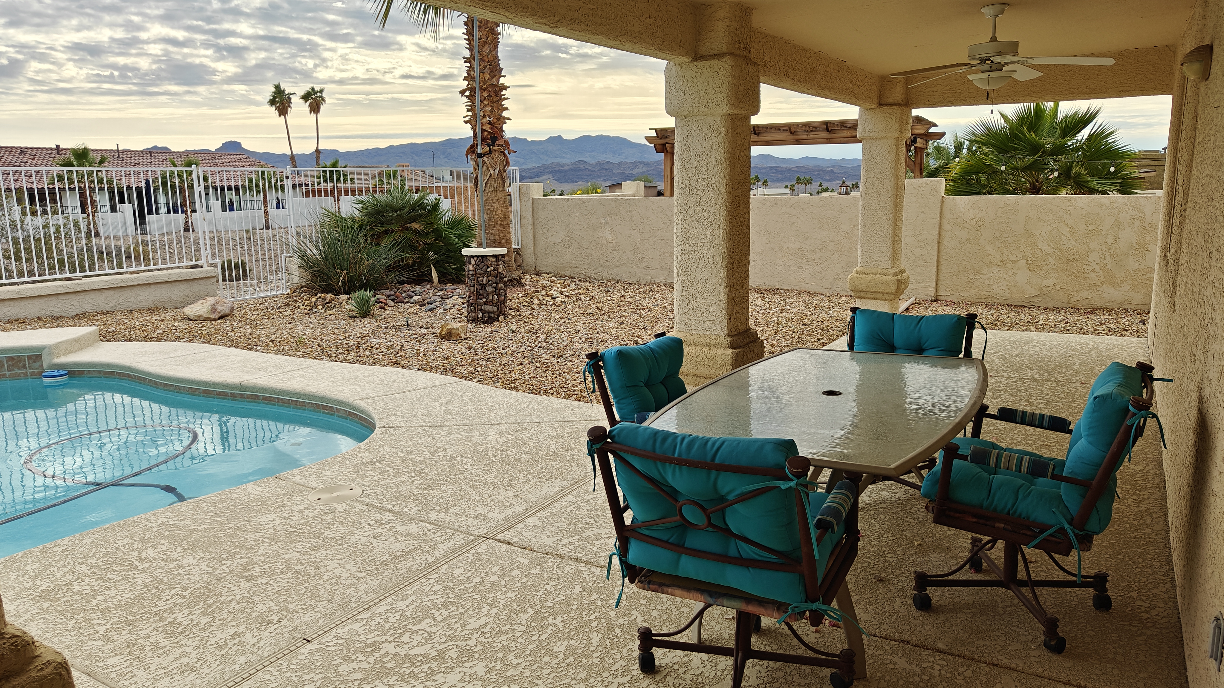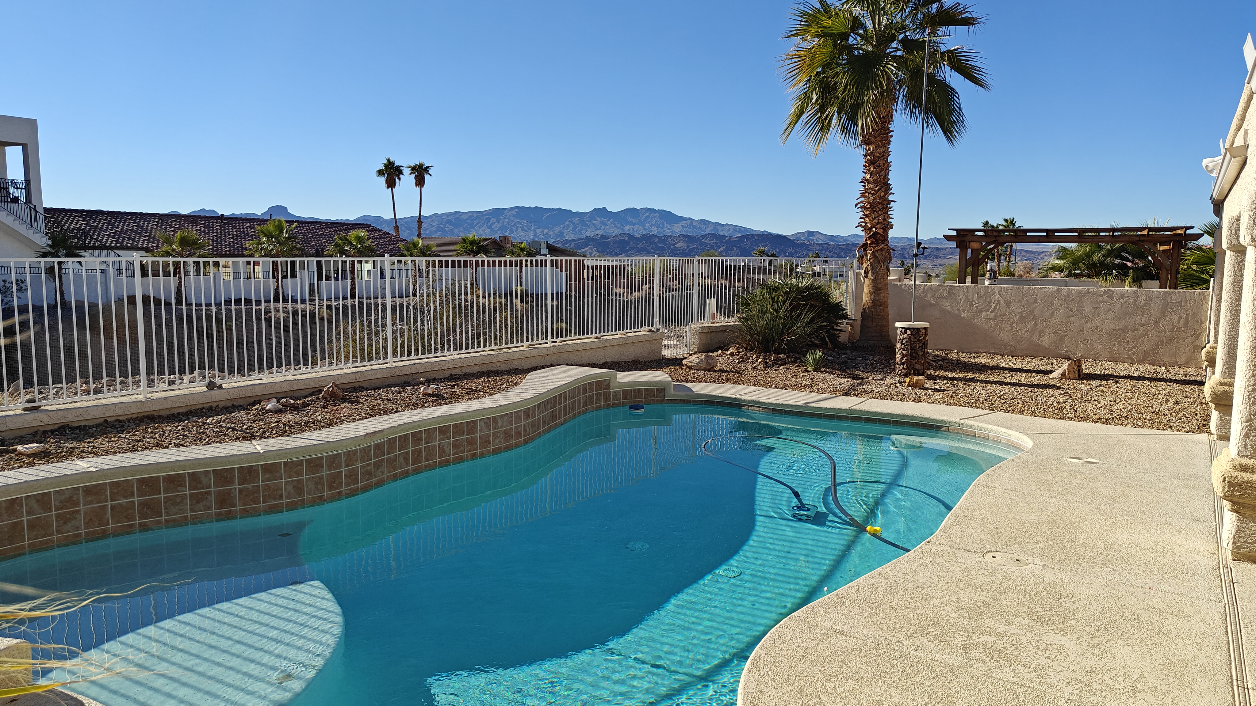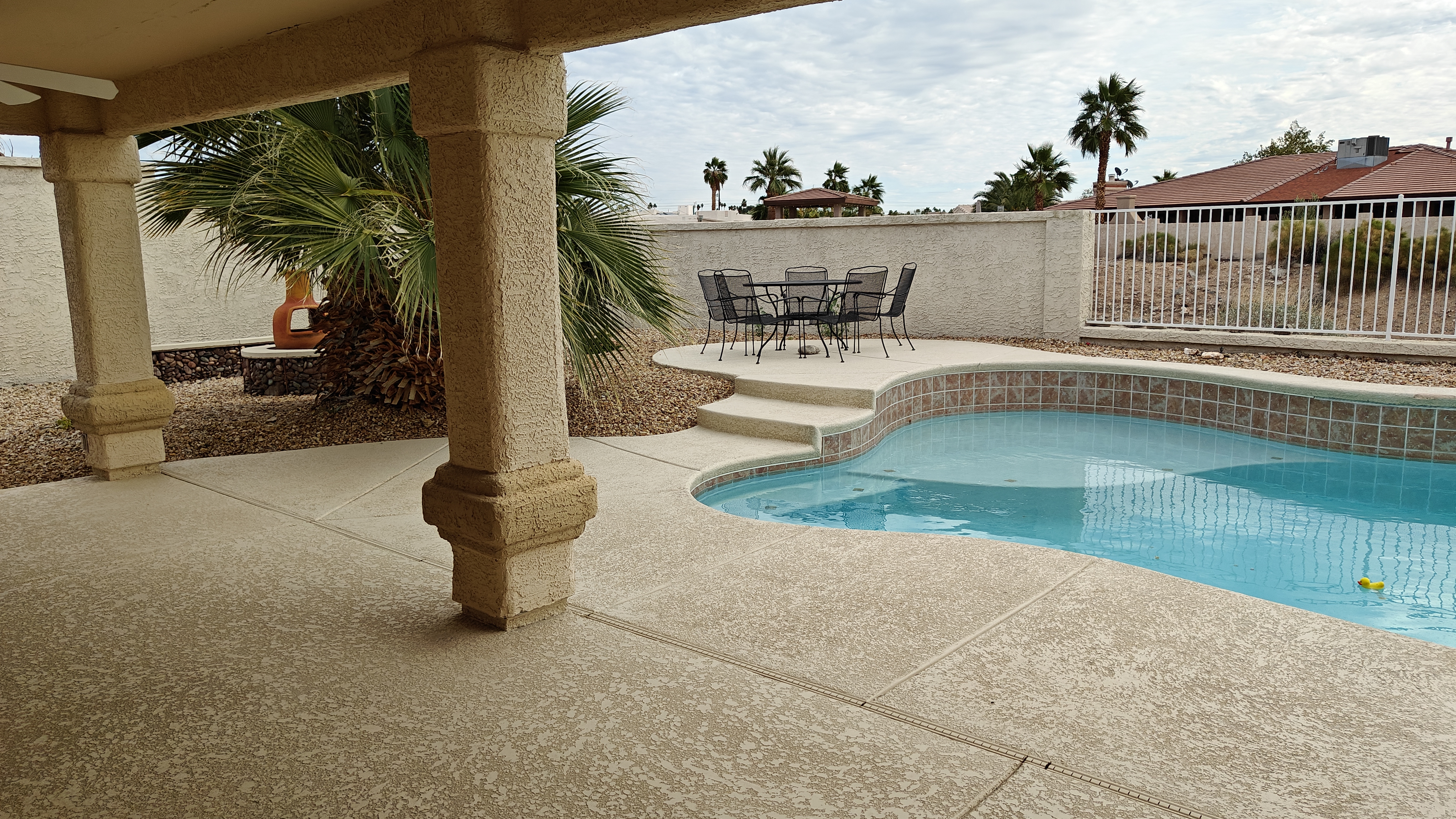 Our home has 3 bedroom and 2 bathrooms with a spacious private backyard with a large pool and 2 patio seating areas and chiminea for those cool nights. Solar heated pool that's only heated during the spring/summer.