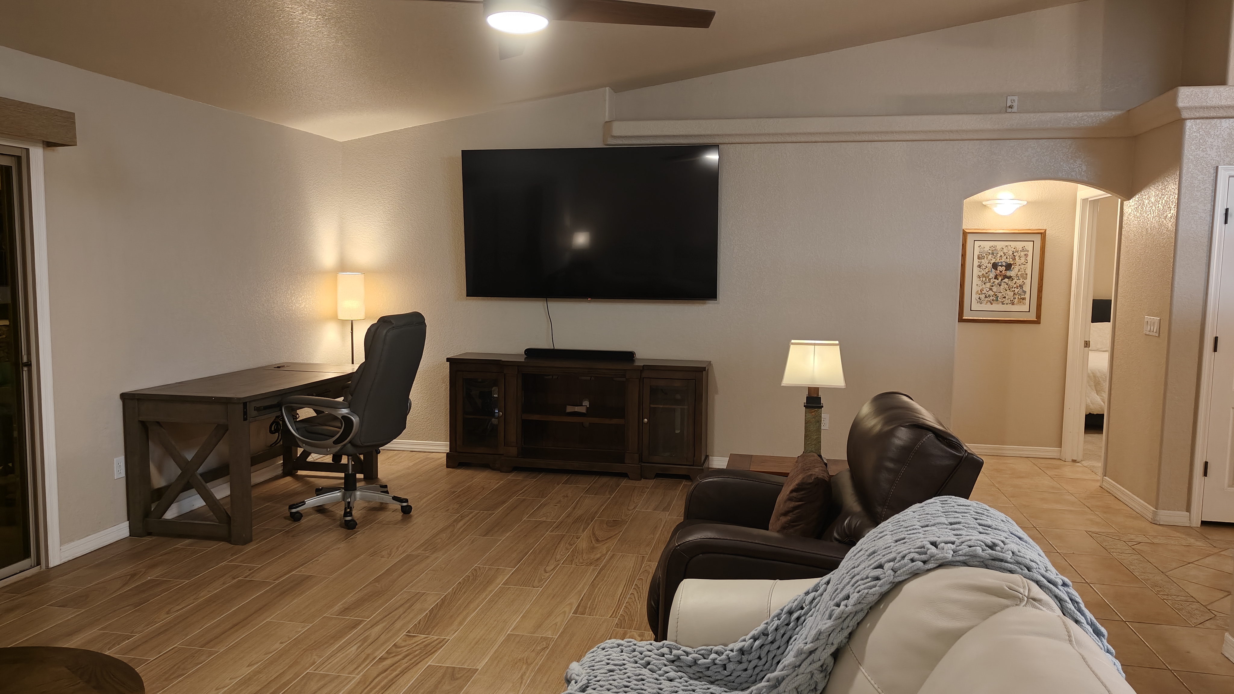 In the living room there is a 86" TV, with a large sectional sofa, leather sofa, and 2 leather swivel recliners that are easy to doze off in.